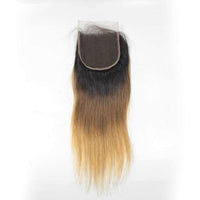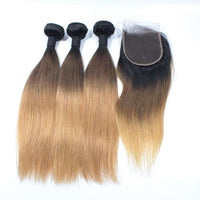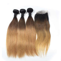 - Human Hair Bundles With Top Lace Closure 3 Tone 1B/4/27 Ombre Blonde Hair Silky Straight Hair 10A